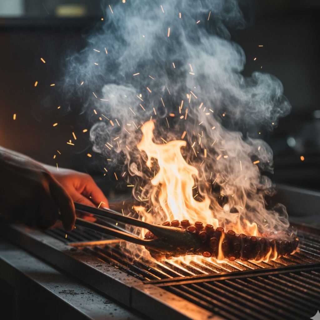Pata de pulpo cocida y terminada en nuestras brasas para un toque crujiente. Servida sobre una suave crema de patata con pimentón de la Vera.